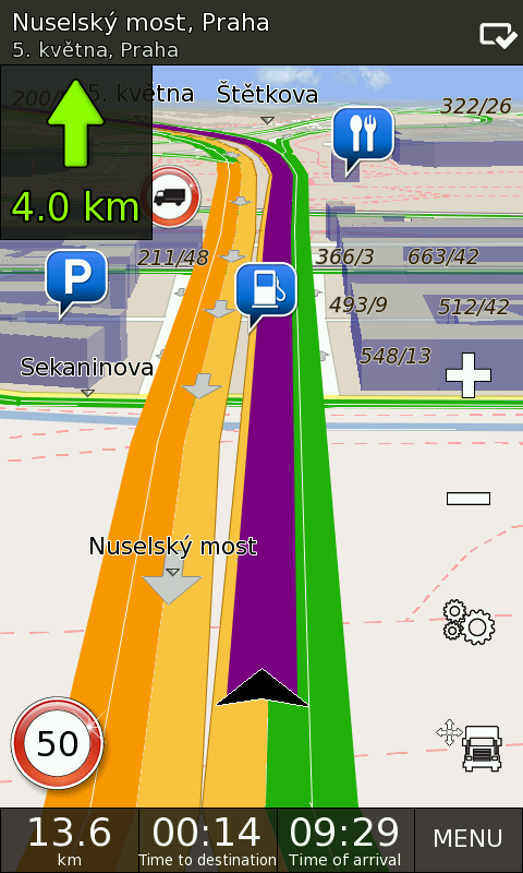 При перемещении, например, при выполнении поворота или разворота, карта тоже поворачивается, делается это полностью в автоматическом режиме. Кроме того, приложение позволяет пользователю сориентироваться по сторонам света. О наличии камер фиксации нарушений программа предупредит пользователя при помощи специального звукового сигнала. Имеется несколько режимов работы – грузовик, легковой автомобиль или пешеход. Соответственно, даже человек, ищущий какой-либо объект без машины, сумеет воспользоваться такой программой. Разработчики предусмотрели сохранение маршрута, мест пребывания, поиск по ним очень удобный.