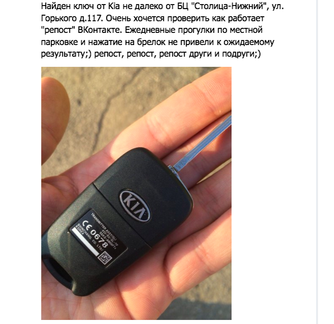 Но если он украден, то вы его, естественно, не найдете. Если же подозреваете, что потеряли его в людном месте (торговый центр, кинотеатр, рынок и т.д.), то можно организовать поиск ключа, дав объявление об утере и денежной компенсации. Можно также дать объявление об утере в социальных сетях, на онлайн-досках объявлений в местные СМИ. В 30% случаев потеря находится.