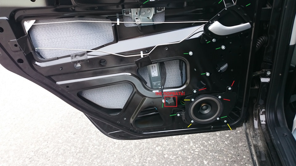 Дребезжание в двери оказалось по причине незатянутых болтов динамика (выделены красным)