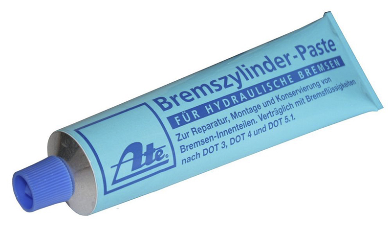Ко второй группе можно отнести синтетические смазывающие пасты, в основе которых использовано минеральное масло с добавлением загустителя из бентонита, с содержанием жирных кислот и металлических частиц. Их отличительной чертой является отсутствие температуры каплепадения с рабочим интервалом от –45°C до +180°C. Прекрасно подходит для смазывания направляющих (пальцев) тормозных суппортов. Вот несколько таких паст разных производителей: ATE Plastilube, Loctite Plastilube, Molykote.